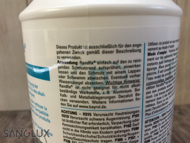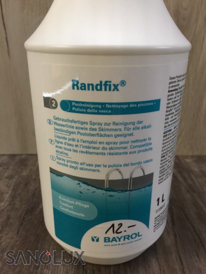 Bayrol Randfix 1 Liter Verbesserte Rezeptur - neu in Sprühflasche Flüssiger, alkalischer Reiniger. Beseitigt mühelos Schmutzränder, Fettränder und Russränder in Schwimmbecken. Durch die Verbesserung der Rezeptur wirkt Randfix jetzt noch schneller und effektiver gegen Schmutz. Die neue praktische Sprühflasche macht die Anwendung noch einmal einfacher: einfach aufsprühen, etwas einwirken lassen und sauber ist der Beckenrand.