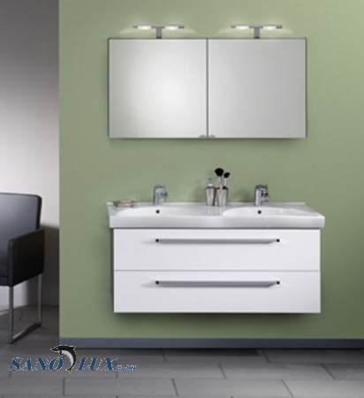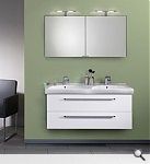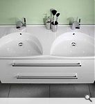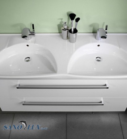 Doppelwaschtisch in Keramik, weiss mit 2 Loch. Stilvoll und elegant. Leichtes Design für 1 oder 2 Armaturen. Bei Bestellung bitte angeben