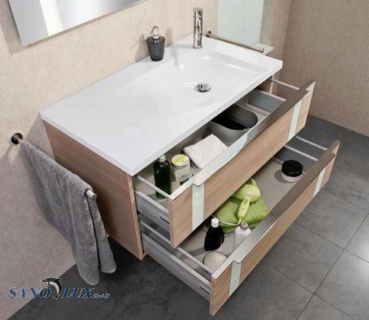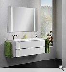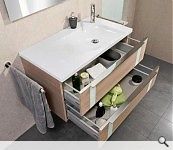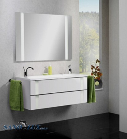 Badmöbelkombination-Set bestehend aus: 1 x Waschtischunterschrank mit 2 Auszügen mit Einzugsdämpfung; (Front grafit- glanz: Glasintarsie mint (Dekorstreifen in Türe) 1 x Mineralgusswaschtisch; 2 Loch für Armatur, links und rechts aussen 1x Vedro 48 Spiegelement mit indirekter LED-Beleuchtung 2 x 3.8 W- 12V, Kaltweiss ohne Schalter,Steckdose 2 x Handtuchhalter, ausziehbar