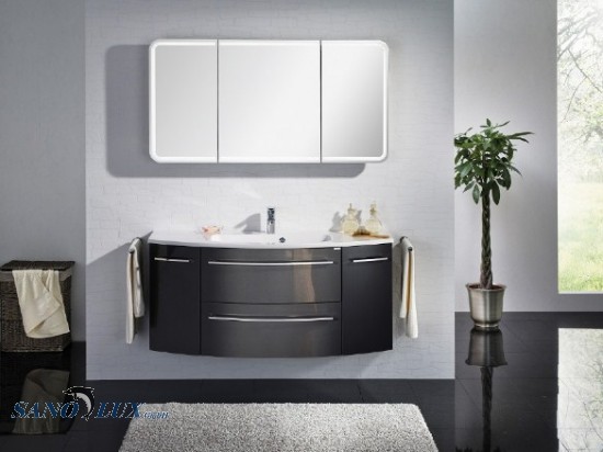 Vedro Front Grafit Glanz, Glasintarsie mint Badmöbelkombination-Set bestehend aus: 1 x Waschtischunterschrank mit 2 Auszügen mit Einzugsdämpfung; (Front grafit- glanz: Glasintarsie mint (Dekorstreifen in Türe) 1 x Mineralgusswaschtisch; 2 Loch für Armatur aussen links und rechts 1x Spiegelschrank LED Türbeleuchtung, 3 Spiegeltüren mit LED-Beleuchtung (je 300/600/300mm breit) 6 Glaseinlegeböden, 2 Mittelwände, 1 CH- Schalter-Steckdosenelement, Farbe: weiss (mögliche Farben: Walnuss-weiss-Pinie-Grafit) 2 x Handtuchhalter, ausziehbar Aufpreis: 2 Stück Armaturen, Einhebelmischbatterie Fr. 980.00 (wie Abbildung)