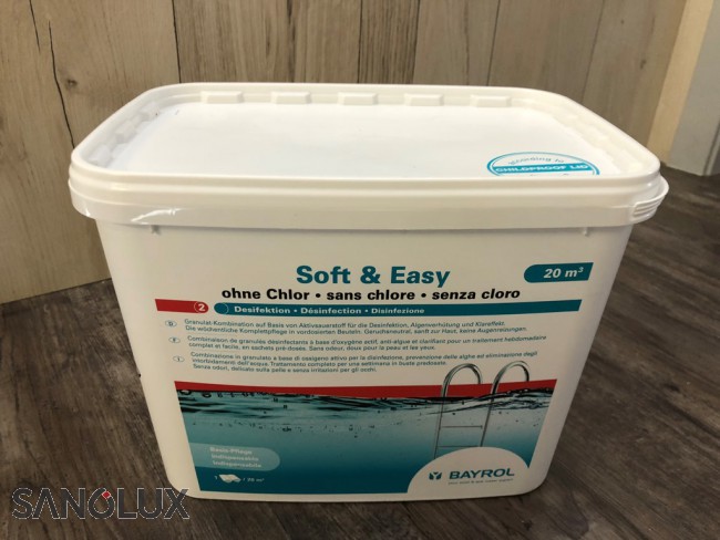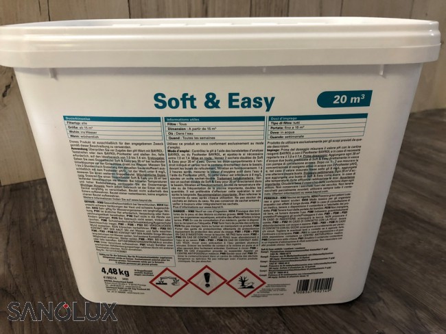 Soft & Easy ist die komplette Schwimmbadwasserpflege in Granulatform. Es enthält alle Wirkstoffe zur zuverlässigen Desinfektion, Algenverhütung und Klareffekt. Damit werden drei Pflegeschritte in einem Handgriff erledigt. Soft & Easy enthält zwei algizide Wirkstoffe. Diese wirksame Kombination deckt ein breiteres Algenspektrum (Breitbandeffekt) als herkömmliche Mittel ab. Somit ist Soft & Easy ebenso ein Allroundmittel gegen Algen. Das Produkt ist pH-neutral, enthält aber spezielle Substanzen zur pH-Pufferung, die große Schwankungen des pH-Wertes abfangen. Der enthaltene Härtestabilisator wirkt gegen Kalkausfällungen. 1 Dosierbeutel reicht für 20 m³ Wasser. Die Zugabe erfolgt direkt ins Becken.