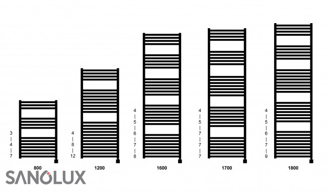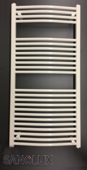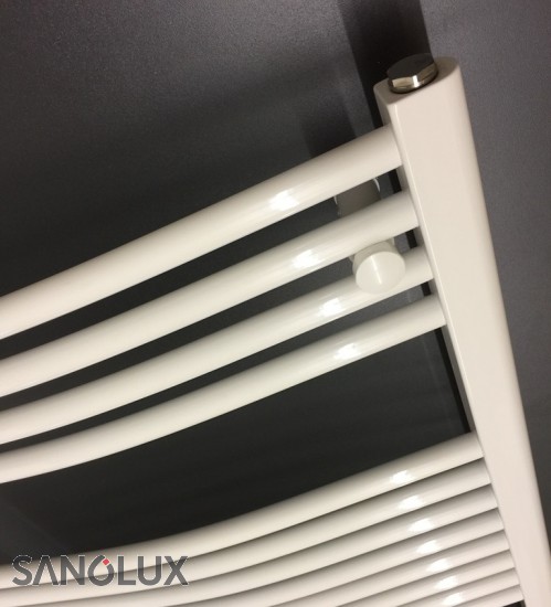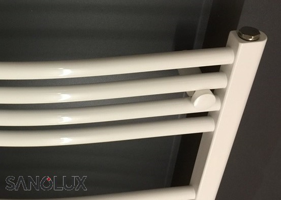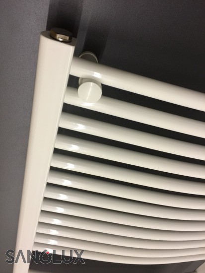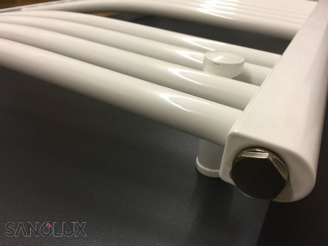 Sanolux CLASSIC Badheizkörper, weiss, gebogen, Einbau mit Zentralheizung Grösse: 1200 x 600 mm (HxB) Konstruktion: - Senkrechtes "D" Profil 40 x 30 mm, - waagrechte, leicht nach vorn gebogene Rundrohre - Durchmesser 22 mm Standard- Ausstattung: - verstellbare Wandkonsolen aus ABS Kunststoff weiss - Regulierbarmöglichkeit - 20 mm inkl. Schrauben - Entlüftungsventil