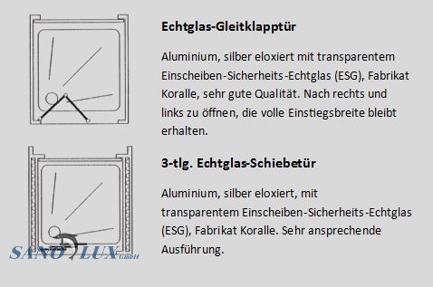 Abb. links: SOUVERÄN mit Echtglas-Gleitklapptür, 18-l-Warmwasserspeicher (dadurch 32cm Einstieg) und Abwasserpumpe (330.88.N + 901 + 921) Abb. rechts: Fertigdusche SOUVERÄN mit 3-tlg. Echtglas-Schiebetür, Duschwanne 90 x 90 cm und niedrigem 17cm Einstieg (330.99.N)