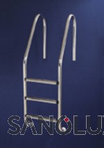 Einbauleiter Comfort (weite Bauform) aus V2A (1.4301), mit Einbauhülsen zum Einbetonieren, Holme Ø 43 mm, mit anatomisch geformter Trittstufe. 4-stufig! (Bild zeigt 3 Stufen) Geeignet für Becken bis 150cm Tiefe.