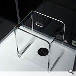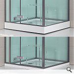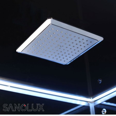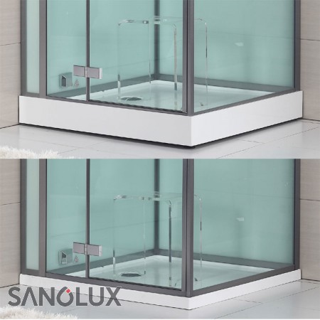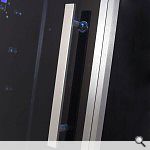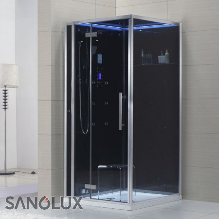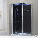 Dampfdusche DZ989 F12-Serie 100x100cm links Ausführung: [X] linke Version [ ] rechte Version [X] inklusive Duschtasse, wahlweise flach mit Siphon im Boden (50mm) oder hoch mit Schürze (150mm) montierbar. [ ] ohne Duschtasse, Montage direkt auf bauseits gefliesten Boden Farbe Glasrückwände: [X] schwarz [ ] weiss (grünschimmer) - Glasduschkabine aus 6 und 8mm Sicherheitsglas (ESG) - Rückwand aus undurchsichtigem Echtglas - Seitenprofile in Alu gebürstet - sehr edel - massive Metallbeschläge und Scharniere - Armaturen mit Thermostat - Anzeige der Wassertemperatur im Display (EAGO Patent) - XXL-Regendusche - beleuchteter Deckenhimmel (indirekte Beleuchtung) - Entlüftungseinrichtung - digitale Temperatur- und Zeitsteuerung - 3 kW Dampfgenerator - Aromatherapie über Dampfauslass - Überhitzungsschutz und Trockenlaufschutz - Farblicht mit Fadefunktion (für weiche Übergänge) - glasbündige Scharniere - Ablagefach aus Glas - Handbrause - 6 Hydro-Massagedüsen - Ozondesinfektion - eingebaute Uhr - seitlicher Technikzugang - inkl. Hocker - Musiksystem mit FM-Radio und Bluetooth zum Abspielen eigener Inhalte (Streamingportal, Webradio, Mediathek) - Stehhöhe in der Kabine ca. 200cm - 1200 x 900 x 2265 (Länge x Breite x Höhe - bei hoher Duschtasse über Boden) Anschluss: 230V / 1LNPE / 1x16A / FI Die Auslieferung erfolgt zerlegt in vorinstallierten Modulen.