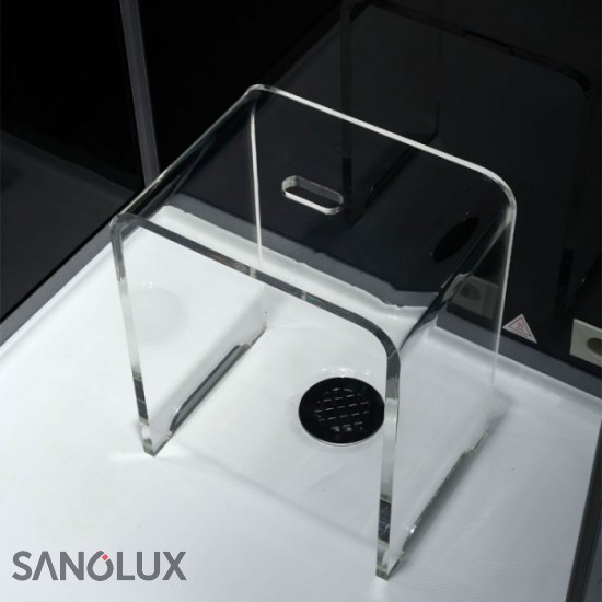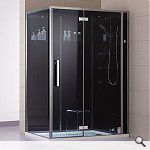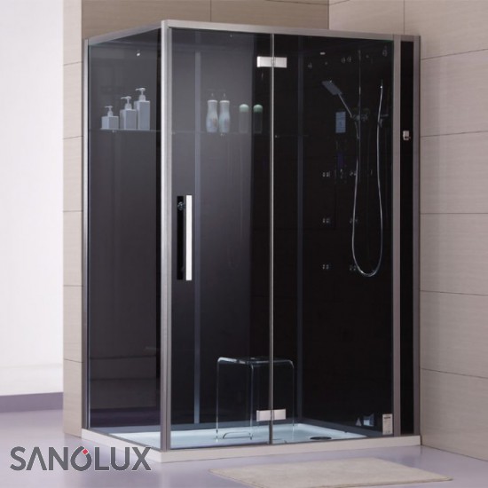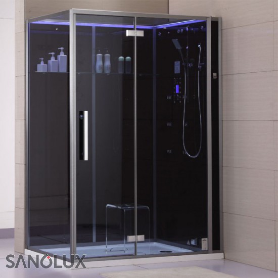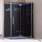 Dampfdusche DZ991 F12-Serie 150x90cm rechts Ausführung: [ ] linke Version [X] rechte Version [X] inklusive Duschtasse, wahlweise flach mit Siphon im Boden (50mm) oder hoch mit Schürze (150mm) montierbar. [ ] ohne Duschtasse, Montage direkt auf bauseits gefliesten Boden Farbe Glasrückwände: [X] schwarz [ ] weiss (grünschimmer) - Glasduschkabine aus 6 und 8mm Sicherheitsglas (ESG) - Rückwand aus undurchsichtigem Echtglas - die durchsichtigen Frontglasscheiben sind leicht abgetönt - Seitenprofile in Alu gebürstet - sehr edel - massive Metallbeschläge und Scharniere - Armaturen mit Thermostat - Anzeige der Wassertemperatur im Display (EAGO Patent) - XXL-Regendusche - beleuchteter Deckenhimmel (indirekte Beleuchtung) - Entlüftungseinrichtung - digitale Temperatur- und Zeitsteuerung - 3 kW Dampfgenerator - Aromatherapie über Dampfauslass - Überhitzungsschutz und Trockenlaufschutz - Farblicht mit Fadefunktion (für weiche Übergänge) - glasbündige Scharniere - Ablagefach aus Glas - Handbrause - 6 Hydro-Massagedüsen - Ozondesinfektion - eingebaute Uhr - seitlicher Technikzugang - inkl. Hocker - Musiksystem mit FM-Radio und Bluetooth zum Abspielen eigener Inhalte (Streamingportal, Webradio, Mediathek) - Stehhöhe in der Kabine ca. 200cm - 1500 x 900 x 2265 (Länge x Breite x Höhe - bei hoher Duschtasse über Boden) Anschluss: 230V / 1LNPE / 1x16A / FI Die Auslieferung erfolgt zerlegt in vorinstallierten Modulen.