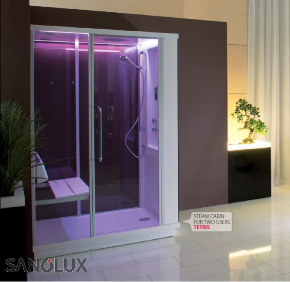 Die exklusive Dampfduschkabine mit Duschwanne und Rückwand aus samtiger Xonyx-Steinmasse - Qualität die man fühlt. Konzipiert für 2 Personen lässt sich die Kabine in allen Varianten in den Raum stellen - mit Glasrückwand sogar freistehend im Raum. Schlanke Profile und eine indirekte LED-Beleuchtung mit sanften Farbübergängen tragen zum modernen und leichten Erscheinungsbild bei. Das Hydromassagesystem mit vorprogrammierten Therapiesequenzen sorgt für ein unvergleichliches Duscherlebnis. Ausstattung TETRIS: