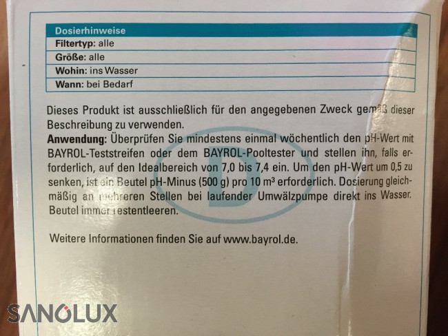 Bayrol pH-Minus 2kg in Dosierbeuteln à 500gr Schnelllösliches Säuregranulat in Beutel für einfache und sichere Dosierung. 1 Beutel auf 50m3 reduziert den pH-Wert um 0,1.