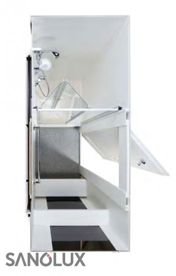 Fertigbad SPARTA Mögliche Ausführungen: [ ] 58.LBR [ ] 58.LBL [ ] 58.RBL [ ] 58.RBR Grösse (BxTxH): 208.5 x 86.5 x 226cm Austattung: [X] Dusche [ ] WC [ ] Urinal [ ] Waschtisch mit Unterschrank [ ] Handwaschbecken [X] Vorraum mit Sitzbank Allgemeine Beschreibung Fertigbäder:
