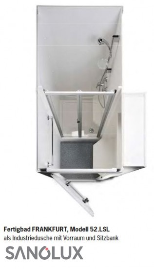 Fertigbad FRANKFURT Mögliche Ausführungen: [ ] 52.LBR [ ] 52.LBL [ ] 52.RBL [ ] 52.RBR [ ] 52.LSR [ ] 52.LSL [ ] 52.RSL [ ] 52.RSR Grösse (BxTxH): 162.5 x 103 x 226cm Austattung: [X] Dusche [ ] WC (bodenstehend) [ ] Urinal [ ] Waschtisch mit Unterschrank [ ] Handwaschbecken [X] Vorraum mit Sitzbank Allgemeine Beschreibung Fertigbäder: