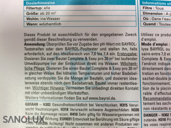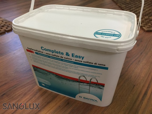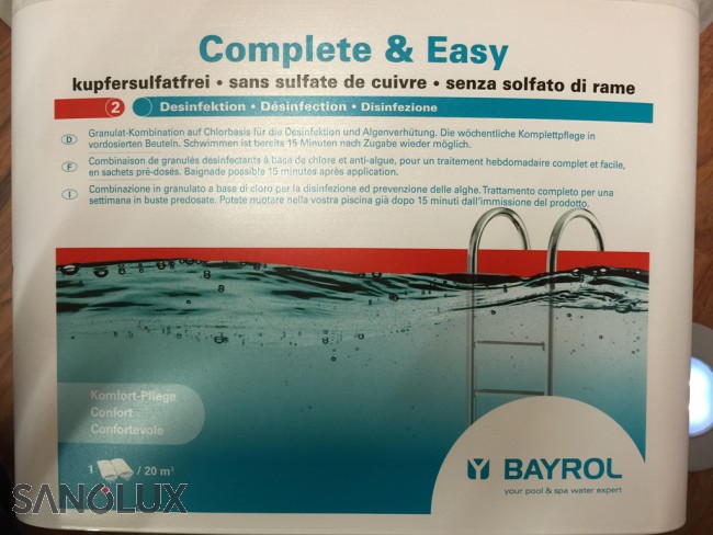 Gebinde: 4,48 kg (16 Doppelbeutel) COMPLETE ist die neue komplette Schwimmbadwasserpflege auf Basis von Chlor und Aktivsauerstoff in Granulatform. Wirkstoffe zur zuverlässigen Desinfektion, Algenverhütung und Klareffekt sorgen für superklares Wasser. Der grosse Vorteil von COMPLETE ist, dass es 40 % weniger Chlor enthält, aber so wirksam wie Chlorilong ist. Portioniert im praktischen Dosier-Doppelbeutel, 1 Doppelbeutel pro 20 m³ Wasser hält eine Woche. Geeignet für AFM/Sandfilter und Kartuschenfilter.