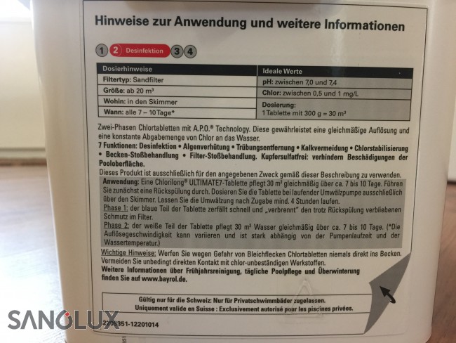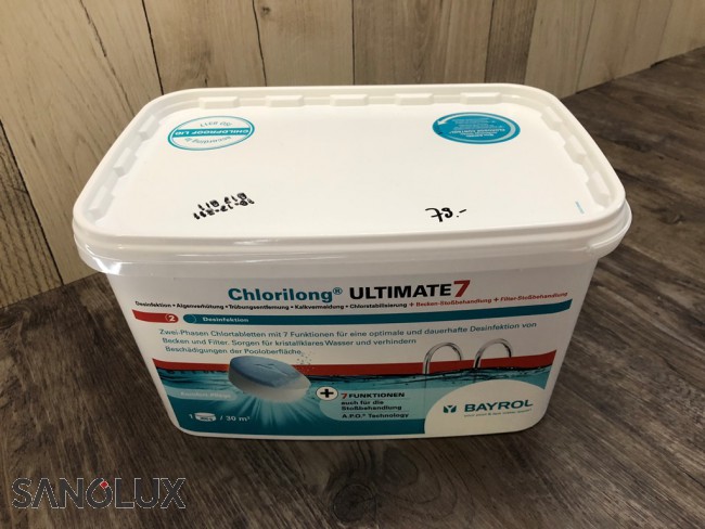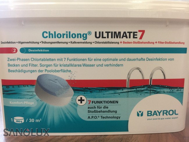 Chlorilong® ULTIMATE 7 (ehem. Varitab®) ist eine 7-Funktionen-Chlortablette (300g) bestehend aus zwei Phasen mit den folgenden Eigenschaften: Desinfektion, Algenverhütung, Trübungsentfernung, Kalkvermeidung, Chlorstabilisierung, Poolwasser-Stoßbehandlung und Filter-Stoßbehandlung. Die zwei Phasen der Chlorilong® ULTIMATE 7 haben unterschiedliche Wirkungsweisen: Der blaue Teil zerfällt in etwa 10 Minuten und lagert sich auf dem Filterbett des Sandfilters ab. Dies bewirkt eine intensive Desinfektion des Filtermaterials. Schmutz und Bakterien werden dadurch sicher entfernt. Der weiße Teil der Tablette ist langsamlöslich und sorgt für eine Dauerdesinfektion. Dank dieser einzigartigen Rezeptur und zusammen mit dem enthaltenen Flockmittel, bietet Chlorilong® ULTIMATE 7 die ultimative Wasserpflege für kristallklares Wasser. Gebinde: 4,8 kg Eimer Dosierhinweise: Filtertyp: Sandfilter Größe: > 20 m³ Wohin: in den Skimmer Wann: alle 7 bis 10 Tage Biozide vorsichtig verwenden. Vor Gebrauch stets Kennzeichnung und Produktinformationen lesen.