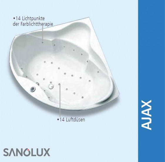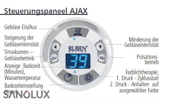 Ruben Whirlwanne Mona Lisa 150x150cm mit Ajax-System Wannentyp: Mona Lisa Eckwanne Grösse: 150/150/49/ ~63cm Wannengrösse: [X] Wanne Standard + CHF 0.00 [ ] Wanne Premium + CHF 600.00 Komplett auf einem Aluminiumrahmen vormontierte Whirlwanne mit LED-Farblichttherapie und edlen Komponenten. Beschreibung: - 14 Luftdüsen auf Wannenboden für Therapiezwecke - 14 Lichtpunkte der Farblichttherapie - Gebläse 800 Watt - Steuerung: Ajax Horizon - Pulsations- und Sinusbetrieb von Gebläse - Anzeige von Badezeit und Badetemperatur - Aktivierung Badezeitimer Systemoptionen: [X] automatische Luftnachtrocknung -> bei Sanolux immer kostenlos dabei [ ] Aromatherapiesystem [ ] Ozonator Optionen gegen Aufpreis: [ ] Acrylschürze Front [ ] Acrylschürze Front & Seite [ ] befliesbare Wannenverkleidung [ ] Wannengriff [ ] Kopfstütze [ ] flache Düsen [ ] FM-Radio mit Bluetooth inkl. Verstärker, Netzteil, Lautsprecher und Fernbedienung (bereits in Wanne eingebaut) [ ] Fernbedienung einzeln DreamLight für erweiterte Steuerung der Farblichttherapie Auf Wunsch können verschiedene Armaturenmodelle in den Wannenrand eingebaut werden. Diverse Wannen in anderen Ausführungen ebenfalls erhältlich. Fordnern Sie unseren Katalog an oder fragen Sie uns an, wir helfen Ihnen gerne weiter!
