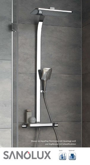 AquaTray Thermostat mit Schwall (Neuheit 2018) mit Echtglas-Ablage (ESG) Glasfarbe weiss (07) · Oberfläche chrom · Sicherheitsthermostat mit 38°C-Sperre · Kopfbrause mit 2 Funktionen: - Rain - Schwall · Anti-Kalk-Noppen · Design-Handbrause AquaSwitch Softcube · Brauseschlauch 1,5 m, silber, mit beidseitiger Verdrehsicherung · Handbrausehalter bei Montage in 3 verschiedenen Höhen montierbar · Keramische 3-Wege Umstellung