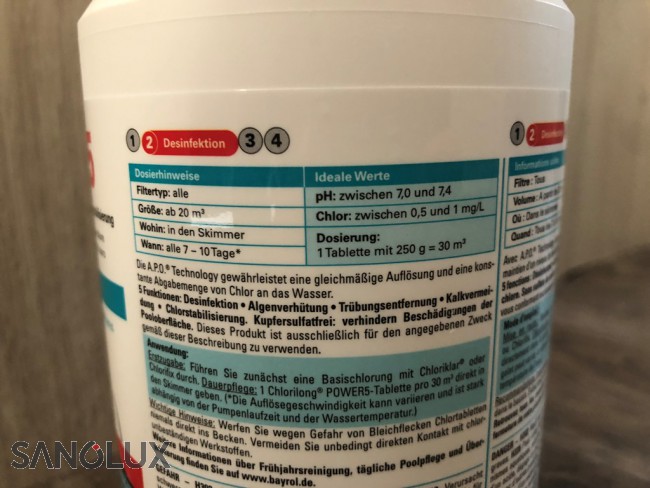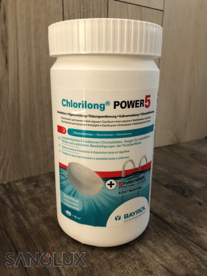 Chlorilong POWER5 ist eine langsamlösliche 250 g Chlortablette mit 5 Funktionen: Desinfektion, Algenverhütung, Trübungsentfernung, Kalkvermeidung und Chlorstabilisierung.