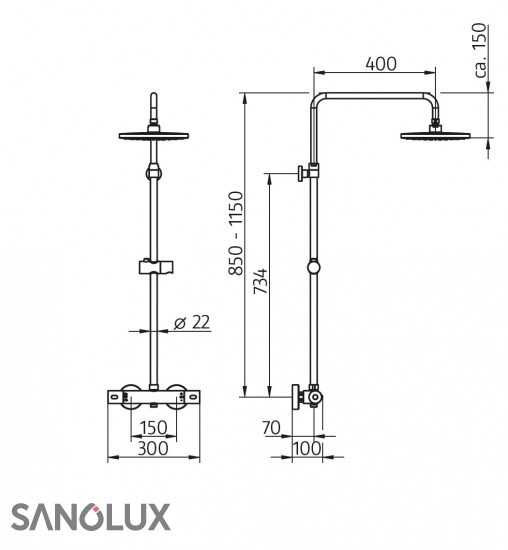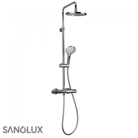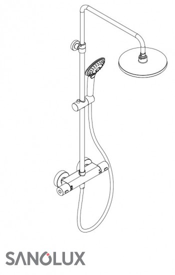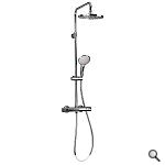 RS 75 Thermostat mit Sicherheitsthermostatarmatur · Oberfläche Chrom · Sicherheitsthermostat mit 38 °C-Sperre · Kaltwasser-Ausfallsicherung · Inkl. Rückflussverhinderer · Kopfbrause Rund, Basic, ∅ 225 mm; Höhe 14 mm, schwenkbar · Höhe der Kopfbrause individuell justierbar · Antikalk-Noppen · Design-Handbrause AquaSwitch Rund, Weiss, mit 3 Strahlarten: · Rain · SoftRain · Massage · Brauseschlauch 1,5 m, Silber, mit beidseitiger Verdrehsicherung · Höhenverstellbare Halterung an der Brausestange