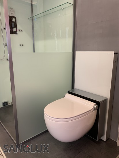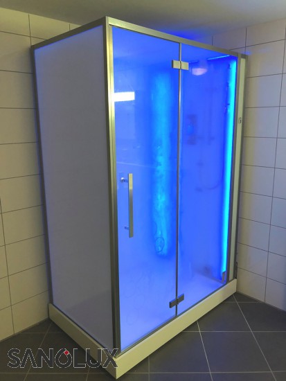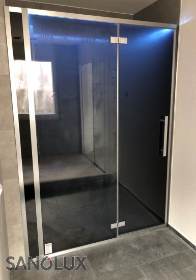 Exklusiv bei Sanolux können Sie die Seitenwände einer Dampfdusche auch in Wunschfarbe foliert beziehen. Damit wird es neben weiteren Faktoren zum Beispiel möglich, eine F12 Dampfdusche in eine Nische zu montieren oder einen Intim-Sichtschutz gegenüber einem WC zu realisieren. Gerne zeigen wir Ihnen die Möglichkeiten bei uns in der Ausstellung "Eins zu Eins" - besuchen Sie uns: www.sanolux.ch/showroom