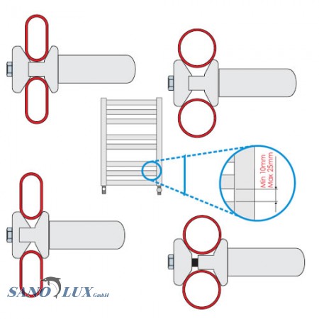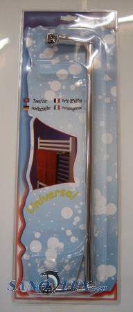 Formschöner Handtuchhalter in chrom für den nachträglichen Anbau an bestehende Badheizkörper. Länge: 370mm Universalhalterung für verschiedenste Rohrdurchmesser und Formen. Mindestabstand zwischen den Rohren 10mm Maximalabstand zwischen den Rohren 25mm