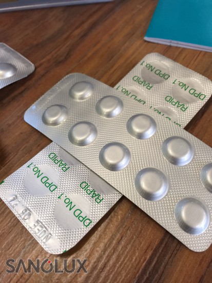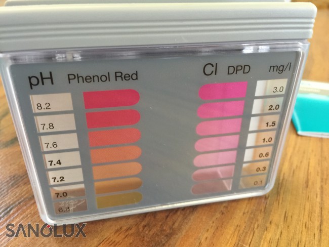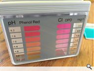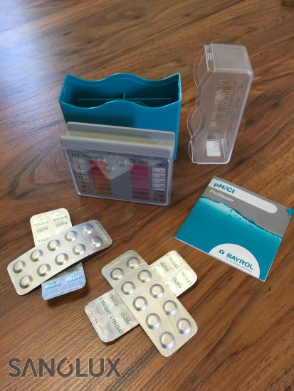 Pool-Tester in Box zur Bestimmung von freiem Chlor und pH-Wert mit Tabletten. Das Set beinhaltet Anleitung, Tabletten und Messbox.